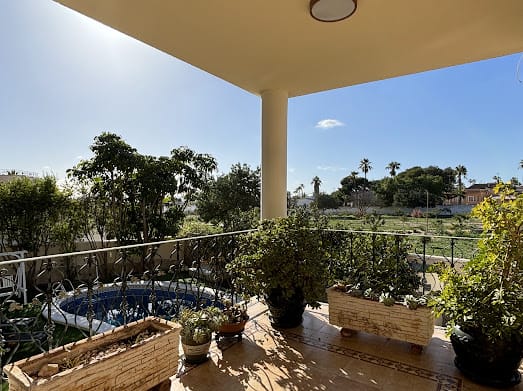 De eerste verdieping heeft 4 slaapkamers (waarvan één een kantoor). De tweede slaapkamer leidt naar een groot terras van 30 m² met een prachtig open uitzicht op de groene omgeving, het park en de zoutvlakten van Torrevieja.